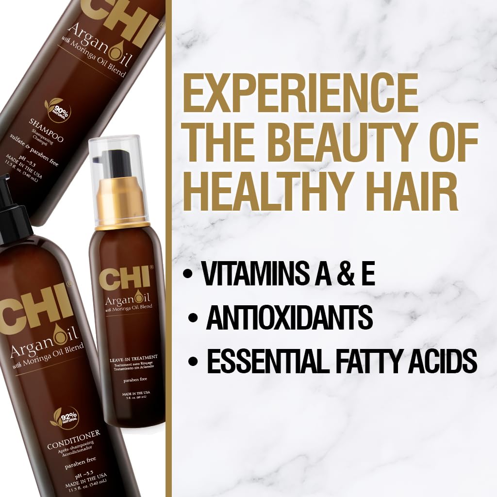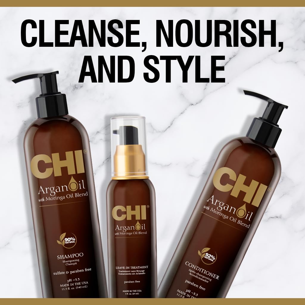 - COMPLETE HAIRCARE SYSTEM: Immerse your hair in the benefits of argan oil; it’s known for its properties that enhance shine, smoothness, and overall hair health. This kit features CHI Argan Oil Shampoo, Conditioner, and a Hair Oil Leave-In Treatment.